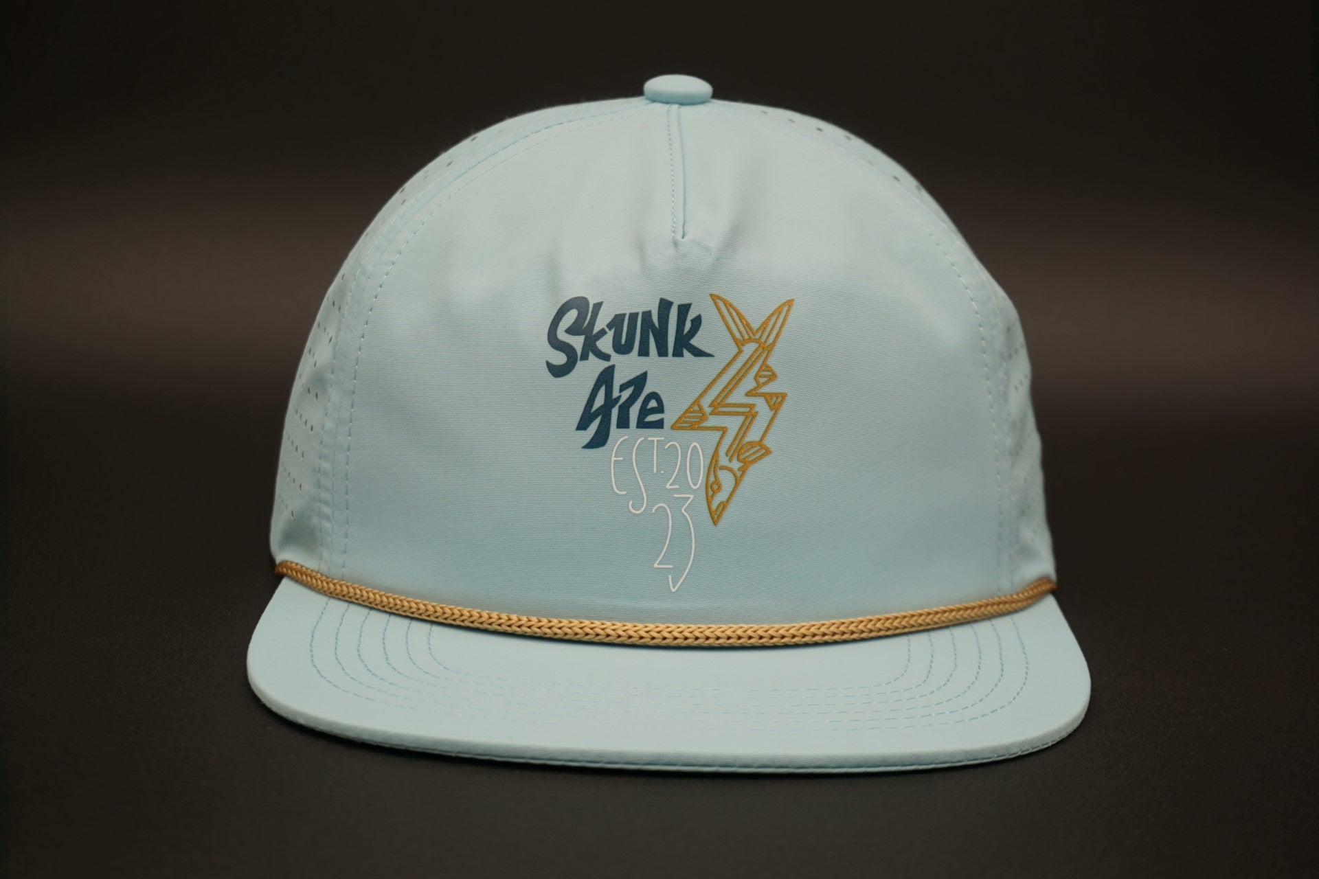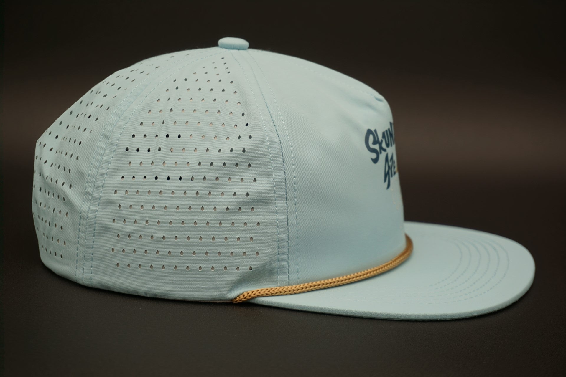 Light Blue and Gold Rope Hat with our Vinyl Bonefish Design - the perfect accessory for your outdoor adventures! The bonefish logo adds a unique touch to the stylish design, while the comfortable fit and perforated back panels make it ideal for all outdoor activities. Get yours today and make a statement on your next adventure!