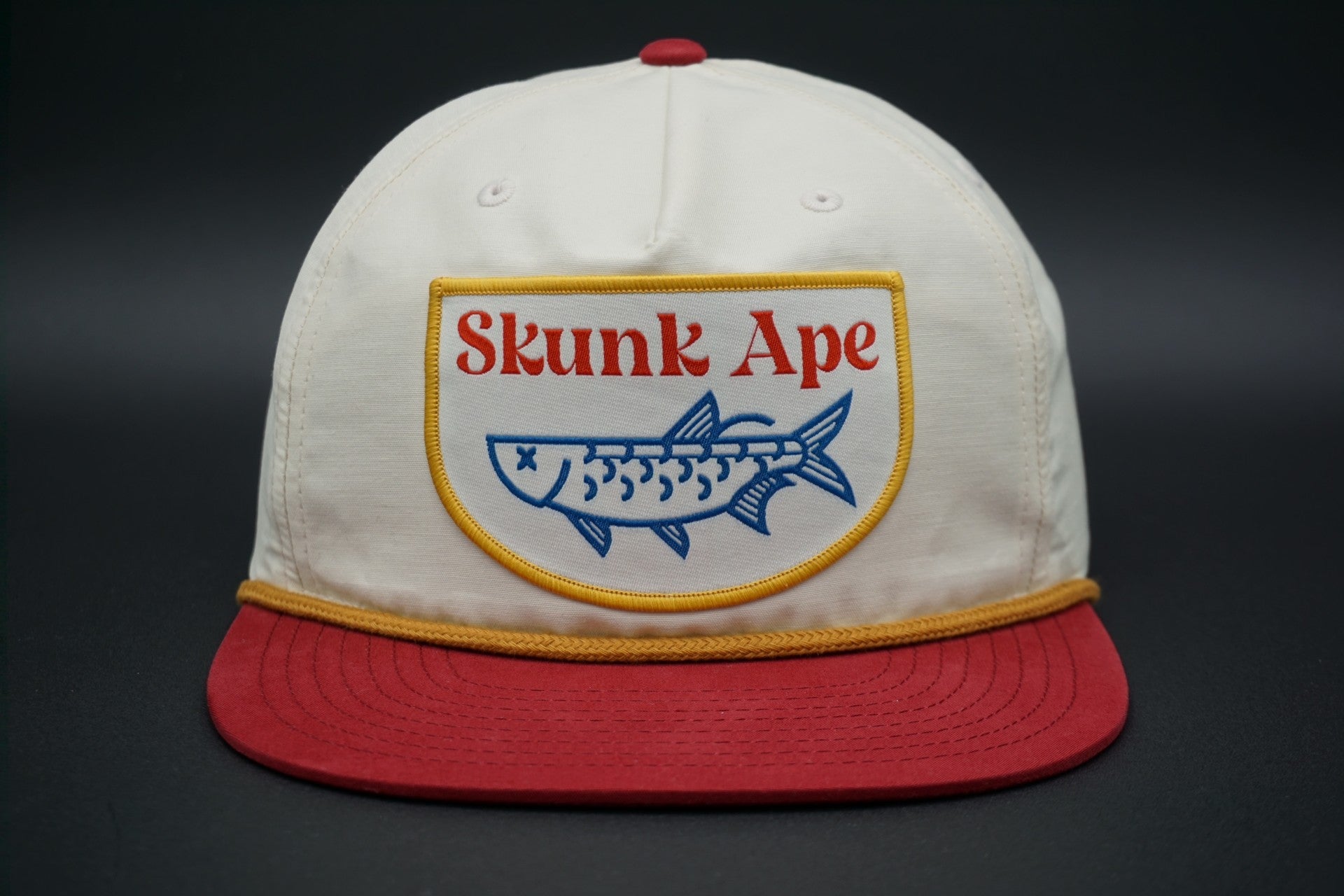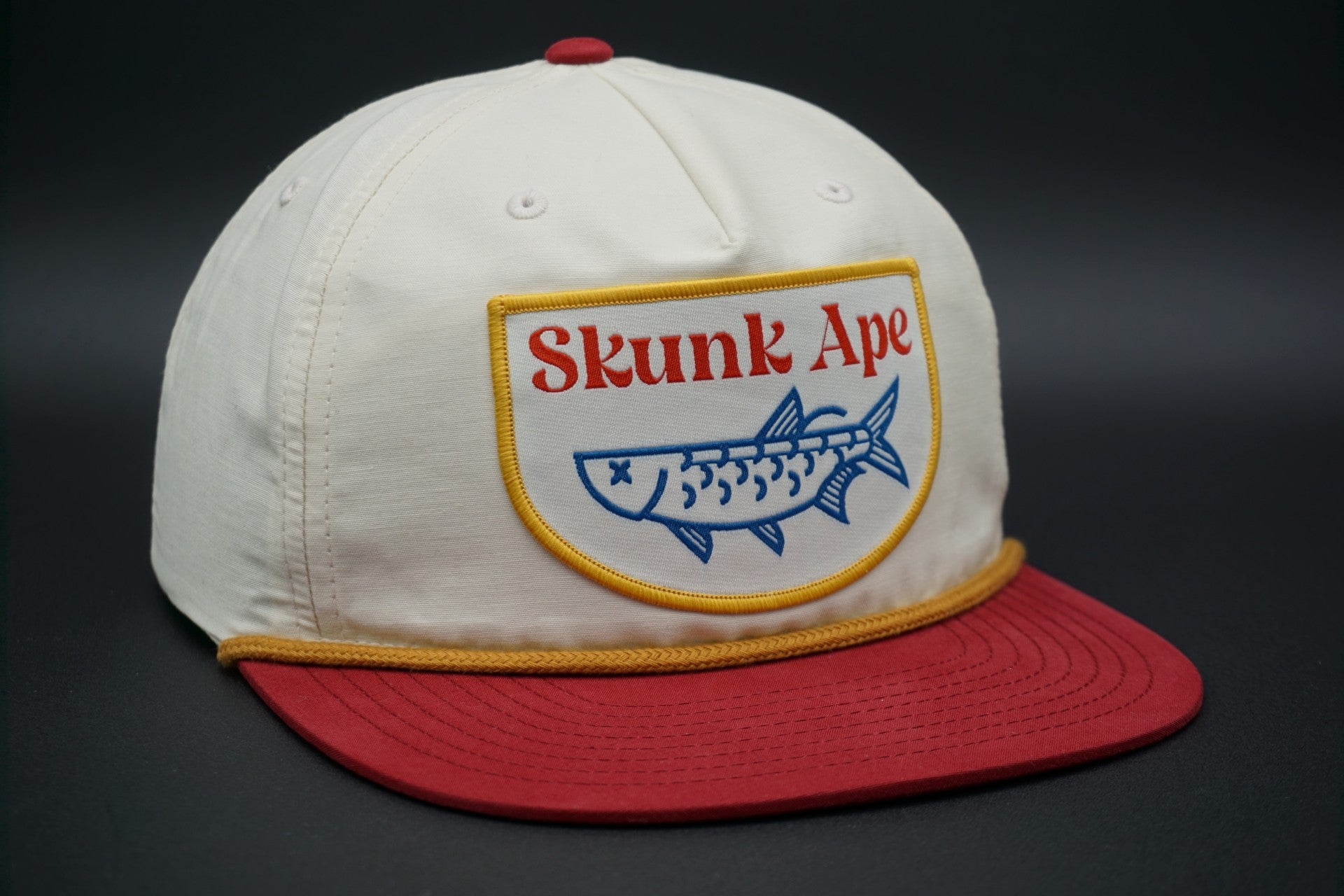 White and Maroon hat with Gold Rope featuring our new Dead Tarpon Woven Patch - the perfect accessory for your outdoor adventures! The tarpon patch adds a unique touch to the stylish design, while the comfortable fit and breathable fabric makes it ideal for all outdoor activities. Get yours today and make a statement on your next adventure