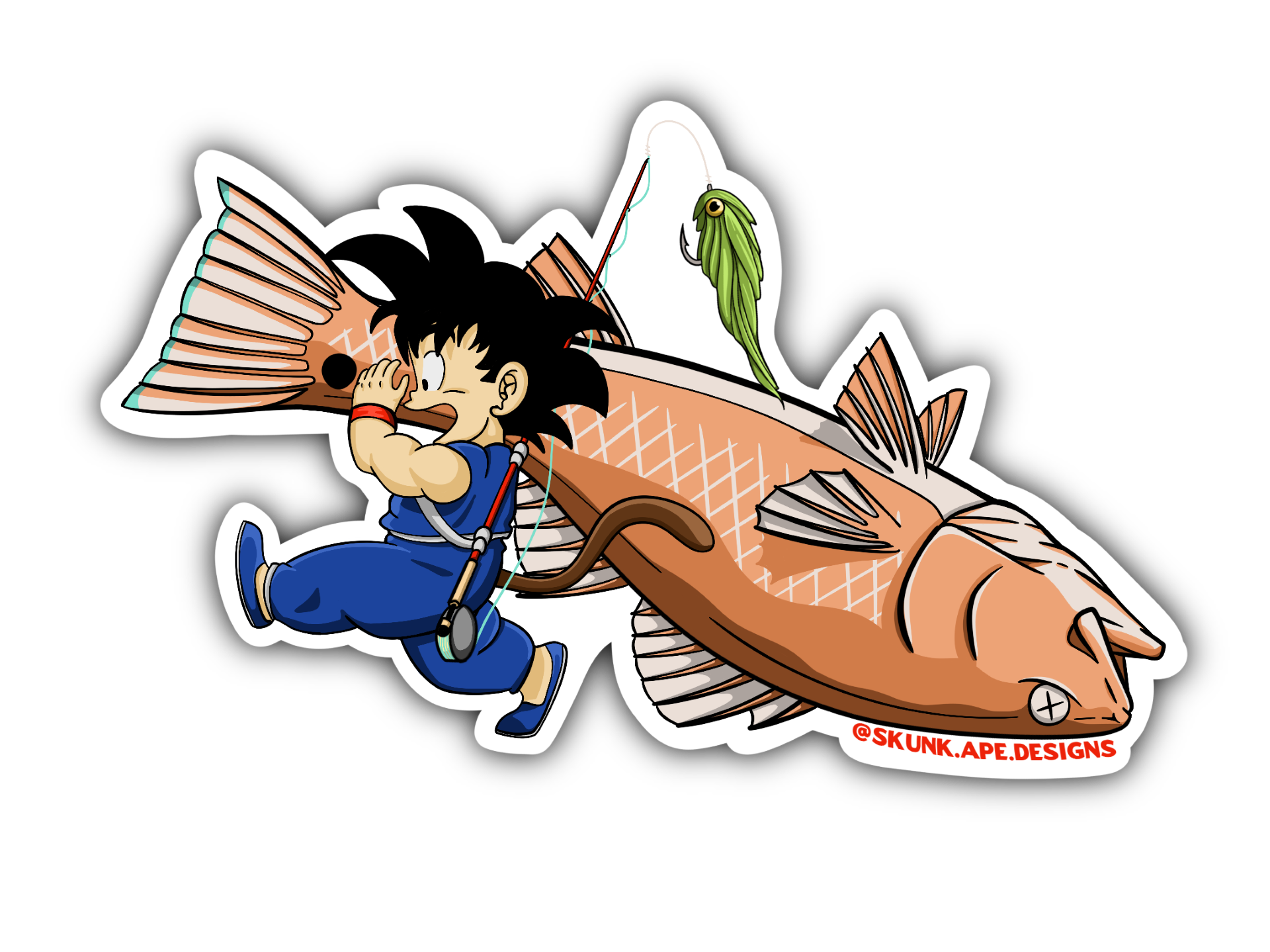 Our take on the popular 90s Dragon Ball TV show. Featuring Goku who just caught a large red fish on fly. This sticker has a durable adhesive backing, making it easy to stick to any smooth surface and ensuring it withstands the elements.