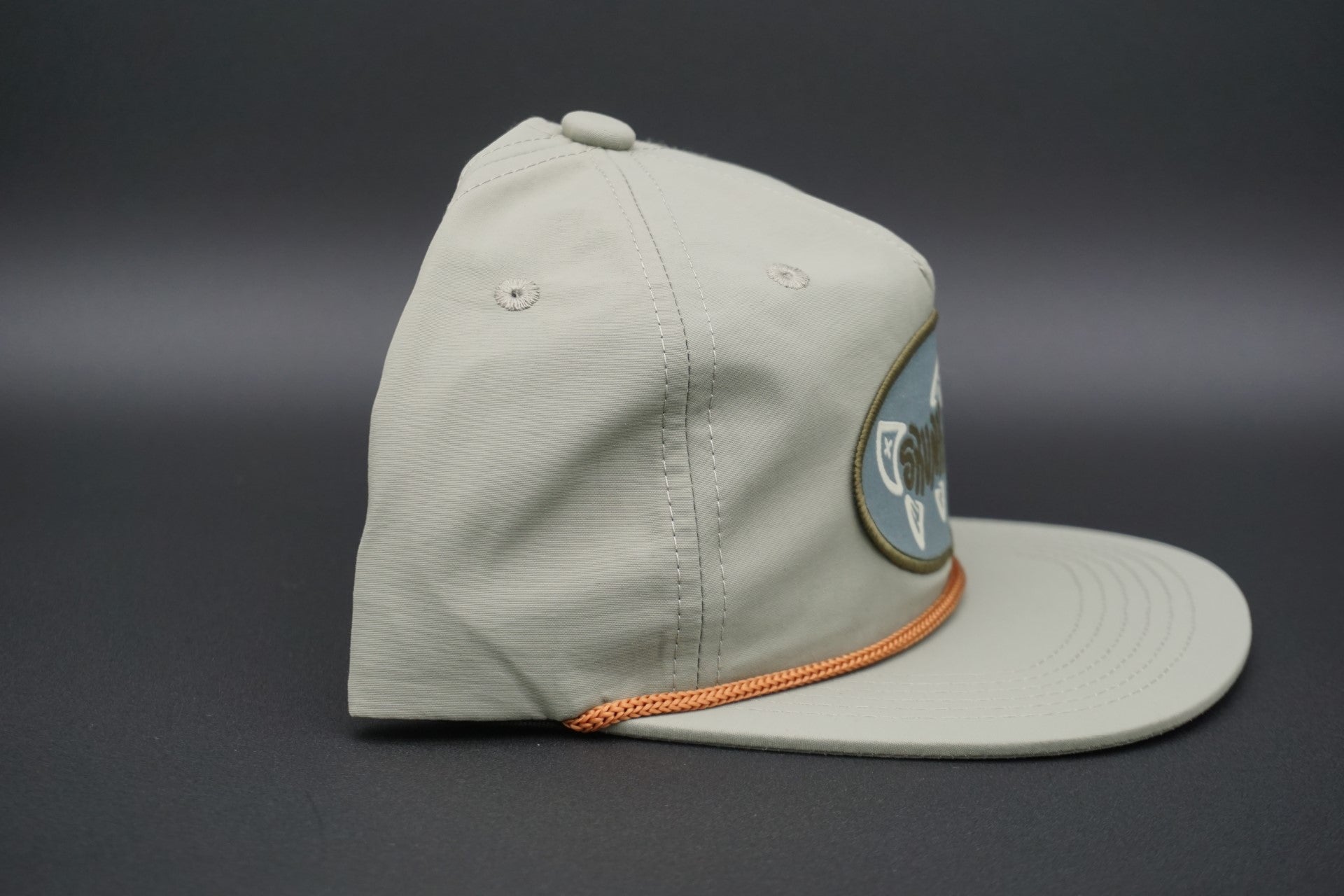 Green with Copper Rope Hat with Dead Tarpon Woven Patch - the perfect accessory for your outdoor adventures! The tarpon patch adds a unique touch to the stylish design, while the comfortable fit and breathable fabric make it ideal for all outdoor activities. Get yours today and make a statement on your next adventure!